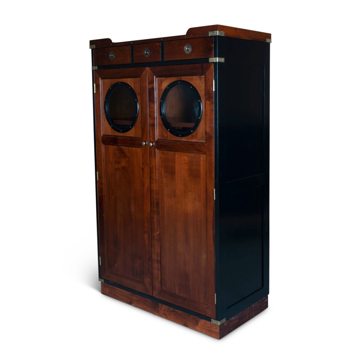 Ein edler 2-türiger Schrank inspiriert vom maritimen Look der 20er Jahre. Dieses elegante Möbelstück verfügt über 3 Schubladen kleine Schubladen (oben) und hinter den Bullaugen Türen 4 stabile Fachböden. Dadurch bietet der Schrank eine Vielzahl von Staumöglichkeiten. Für den Bau wurden hochwertige Kirsch- und Ahornhölzer verarbeitet, die traditionell abgelagert und getrocknet wurden. Die Oberfläche dieses Möbelstücks ist in der "French Finish" - Optik veredelt worden. Eine außergewöhnliche Kombination aus schimmernder Wischlasur und seidenmatt geschliffener Fläche. Das hochwertige Holz ist ein lebendiges, gewachsenes Material, das in Bezug auf Beschaffenheit, Farbe und Maserung variieren kann. Die Beschläge und Applikationen sind aus Messing antikfinish gebürstet.Bitte erfragen Sie vor dem Kauf die genaue Lieferzeit. In der Regel dauert dies 7-10 Werktage.