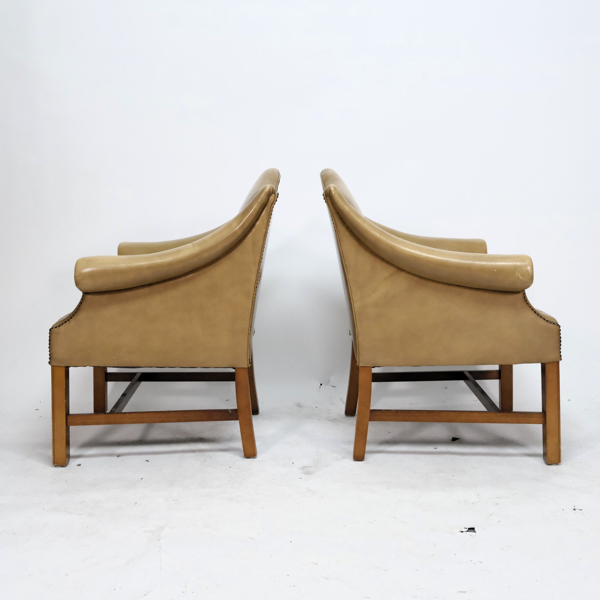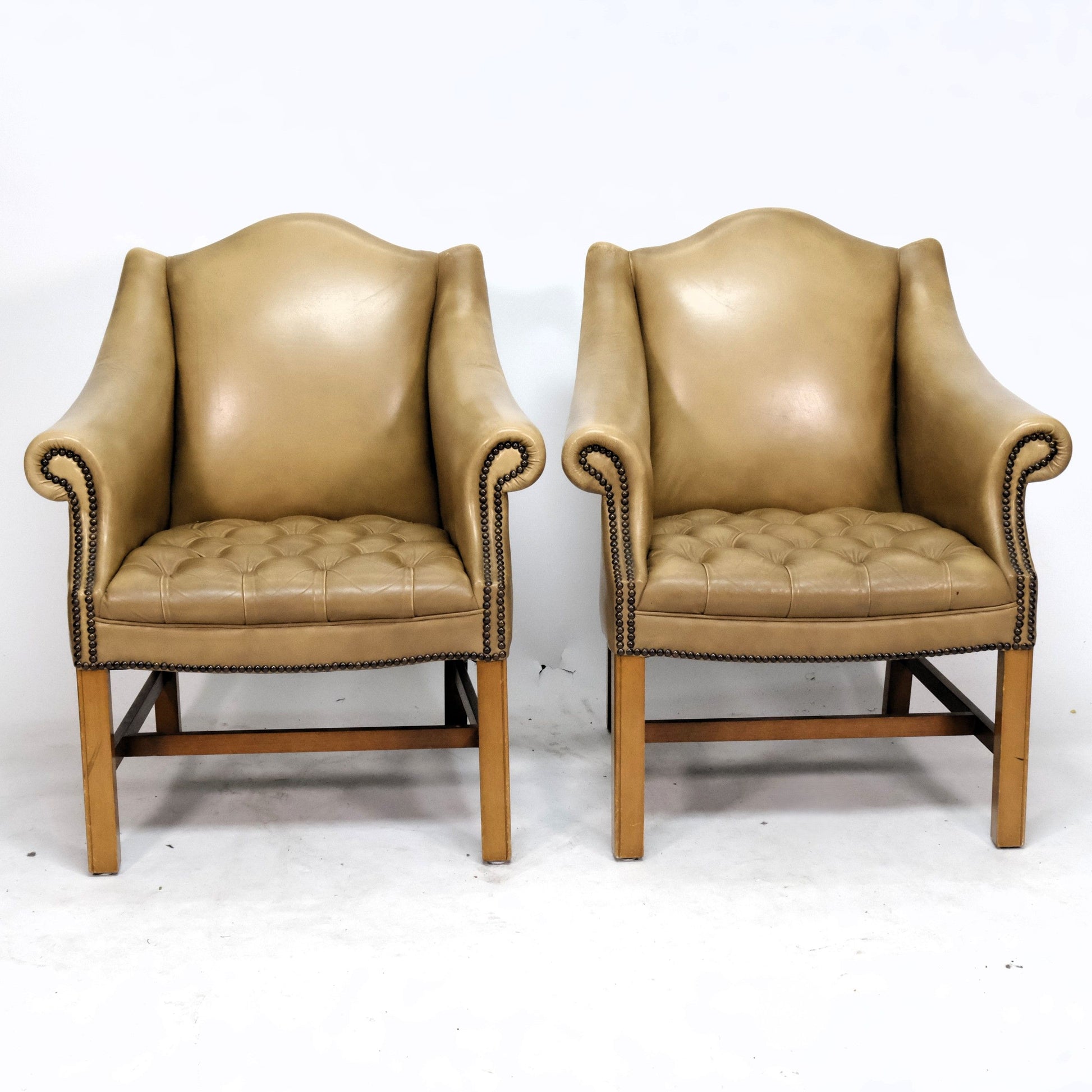 Diese beiden originalen Chesterfield-Sessel von Wade vereinen britische Eleganz mit zeitloser Handwerkskunst. Das klassische Design zeigt sich in der markanten, leicht geschwungenen Rückenlehne, den gerollten Armlehnen und der umlaufenden Ziernagelung. Das hochwertige, cognacfarbene Leder hat über die Jahre eine schöne, authentische Patina entwickelt, die den Sesseln Charakter und Tiefe verleiht. Die bequem gepolsterten Sitzflächen sorgen für angenehmen Komfort, während das stabile Holzgestell mit klaren Linien für einen sicheren Stand steht. Ob als stilvolles Duo im Wohnzimmer, im Herrenzimmer, Büro oder als Akzentmöbel in einer Lounge – dieses Paar strahlt Wertigkeit, Geschichte und Understatement aus und passt sowohl zu klassischen als auch zu modernen Interieurs.
