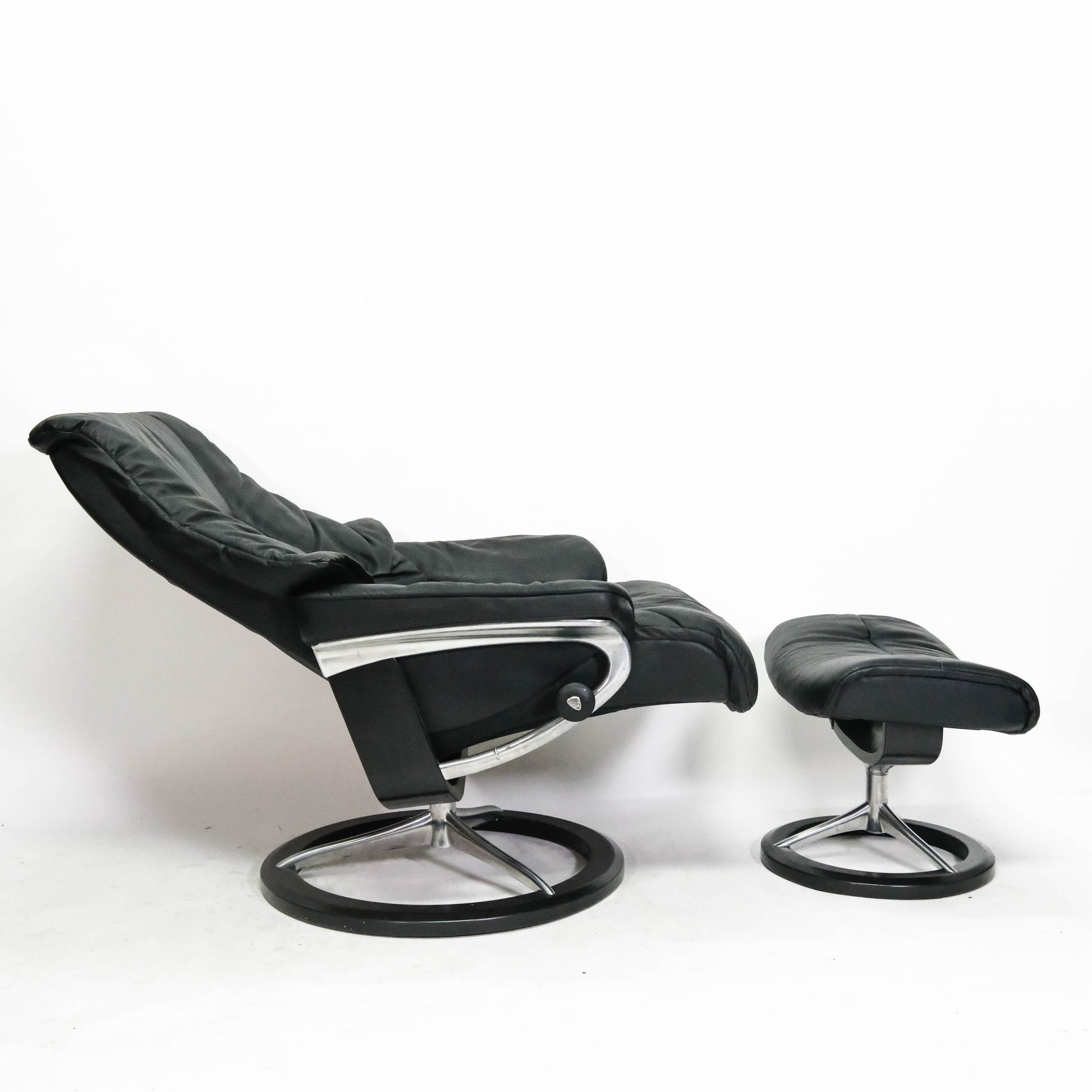 Dieser Stressless Sessel "Live" (L) mit Hocker mit dem Signature Fuß befindet sich in einem sehr guten Zustand mit nur minimalen Gebrauchspuren, die von einem normalen Gebrauch herrühren wie z.B. Falten im Leder (siehe Bilder). Löcher oder Risse hat der Sessel keine. Es befindet sich am Hocker eine kleine Beschädigung (siehe Bilder). Der Sitzkkomfort und die Funktionen des Sessels laufen super. Der Sessel stammt aus einem tierfreiem Nichtraucherhaushalt. Die Bilder sind Teil der Artikelbeschreibung. Es ist für kurze Zeit ein zweiter Sessel vorhanden, welcher auch erworben werden kann.