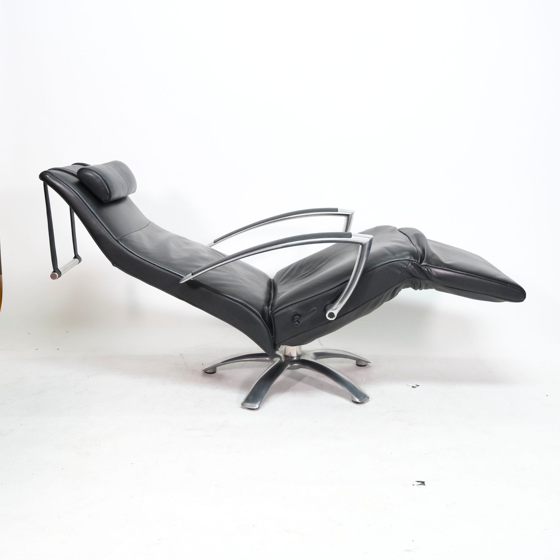 Dieser Jori Brainbuilder Designer Sessel befindet sich in einem sehr guten Zustand mit leichten Gebrauchsspuren wie z.B Falten im Leder und Gebrauchsspuren am Chromgestell (siehe Bilder). Die Funktionen und der Sitzkomfort sind bei diesem Sessel hervorragend. Der Sessel stammt aus einem tierfreiem Nichtraucherhaushalt. Die Bilder sind Teil der Artikelbeschreibung. Der Sessel wird mit dem separate Kissen für die Kopflehne verkauft. Wir haben für kurze Zeit noch einen zweiten baugleichen Sessel auf Lager.